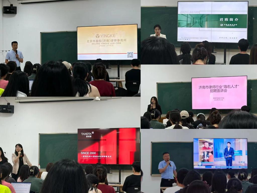 中午1点,北京市盈科(济南)律师事务所、泰和泰(济南)律师事务所、山东环周豪才律师事务所、君致(济南)律师事务所、山东瑞文律师事务所等5家律所依次进行招聘宣讲。各律所详细介绍了各自的台湾娱乐城、职业发展路径以及具体需求和福利待遇等,并与学生亲切互动交流,为学生职业生涯规划提供了多样化视角。