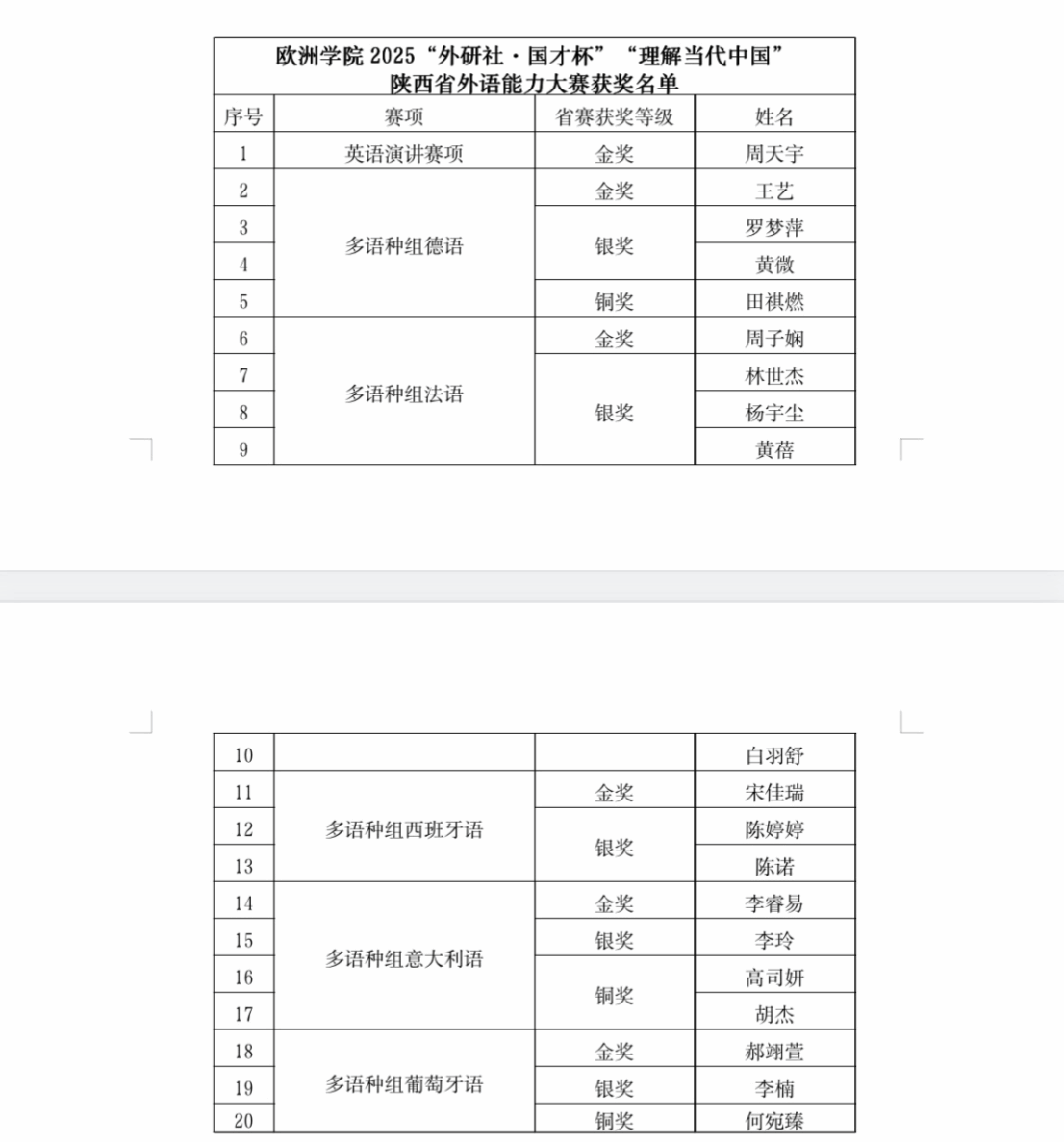 坚决贯彻落实党的教育方针,以“三进”工作为抓手,扎实推进党建引领学科发展、教育教学、队伍建设、人才培养相容共进,促进学生德智体美劳全面发展,培养具有国际视野和跨文化沟通能力的复合型人才。在此向所有获奖同学表示最热烈的祝贺!向为指导学生辛勤付出的各位老师表示衷心的感谢!希望全体同学以获奖同学为榜样,以赛促学,以赛促练,再创辉煌!